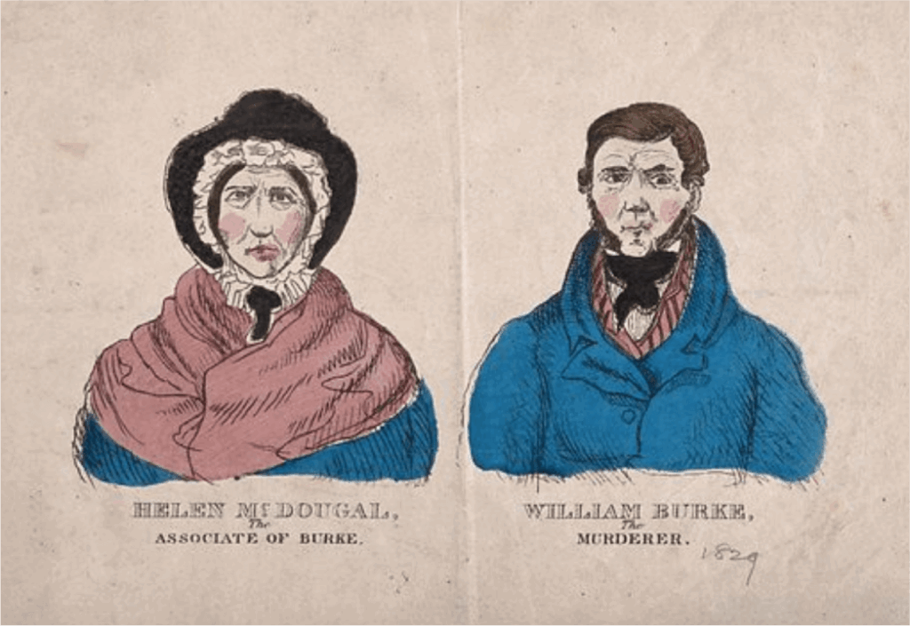 Portraits of William Burke (1792-1829) and Helen McDougal (b. c. 1795), on trial in Edinburgh in 1828 for the west port murders. coloured etching, c. 1829. Wellcome Collection. (n.d.). https://wellcomecollection.org/works/abh7rnua