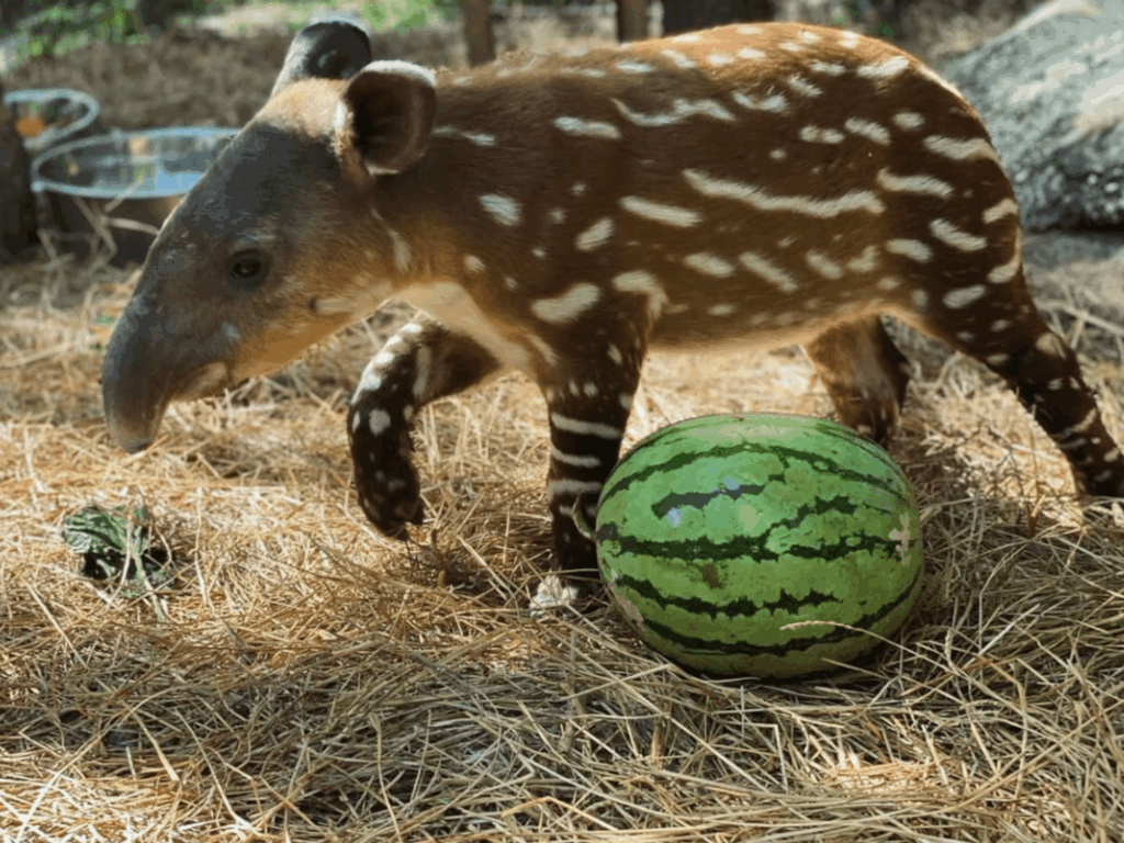 Baby tapirs, like deer fawns, are born with distinctive spots and stripes that aid in camouflage, often referred to as their “watermelon coat.” (Image from the Belize Zoo)